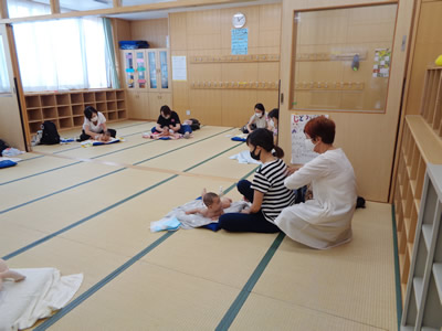 今回は8組という少ない人数でお部屋を広々と使っての開催です。まずはわらべうたで赤ちゃんとふれあい遊び。ママ達の自己紹介では「今まで外出も出来ずにいたので今日を楽しみにしていました」と言う人がほとんどでした。紹介が終わり、緊張が解けたところでマッサージの始まりです。くるりくるりと手をねじりながら、あんよを引っ張って。足の指もくるくるポーン!と引っ張って。お腹とお胸もく~るくる。最後に背中をカプカプカプ!おしりをくるくるくるとマッサージ。みんな気持ち良さそうにニコニコ。ママ達も腕や背中をマッサージしてもらい、赤ちゃんの気持ち良さを体験しました。ママも赤ちゃんもリフレッシュ出来たかな?