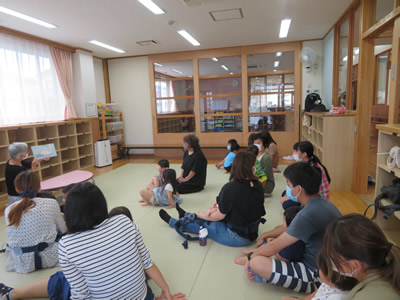 7月から再開した「すまいるタイム」。今回は読み聞かせボランティアの遠藤政子さんに来ていただき、ちょっとスペシャルなすまいるタイム。季節の手遊びやわらべうた、「十五夜」も近かったのでおつきさまのペープサートや絵本も読んでいただきました。ゆったりとした雰囲気に包まれ、大人も子どもも、しばしお話の世界へ・・。次に来ていただくのは11月。どんなお話か楽しみ♪です。すまいるタイムは、毎週月曜日と木曜日の11時から、手遊びや絵本の読み聞かせを職員が行っています。自由参加なので申し込みはありません。お気軽に来てくださいね。