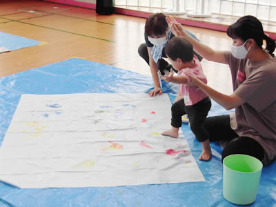 館児童センターでは今年度初めての大きな行事となりました。活動を待ち望んでいてくれた方が多く、募集人数が少なかったこともありますが、募集開始から2日で満席となりました。講師の柴田先生には何度か指導いただいていましたが、今回はどうすればソーシャルディスタンスを保ち活動できるか、打合せを重ねました。例年通りとはいかなかったものの、ゆび絵の具を使ってエコバックに模様をつけたり、歩き始めたばかりのかわいい足の裏に絵の具をつけテーブルクロスに絵を描いたりと、皆さん思い思いの素敵な作品ができあがりました。家ではできないダイナミックな絵の具遊びを行ったことで、楽しかったという声をたくさんいただきました。