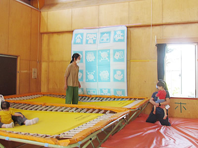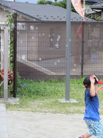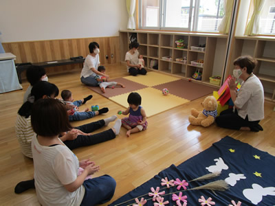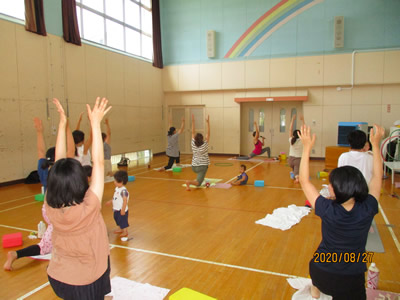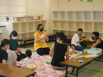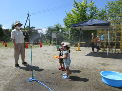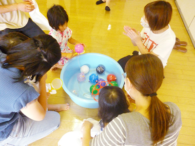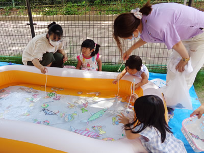 2020/08/27残暑が厳しい中、館庭ですくすくクラブ15人のお友だちが元気に水あそびを行いました。久しぶりにたくさんお友だちが集まり、とても嬉しそうでした。みんなでカラービニールを使って金魚を作り、プールに浮かばせて、親子で協力しながら金魚つりをして楽しみました。またミストシャワーを浴びたり、たらいの中に浮かべた魚を釣ったり、プールに浸かって水浴びをしたりしました。とても暑い中でしたが、とても楽しく親子で遊ぶことができました。最後は水ヨーヨーのお土産ももらい、夏らしい行事となりました。なかなか遊ぶ機会が限られている時ではありますが、水遊びや夏祭り気分を少しで感じてもらえたようでした。