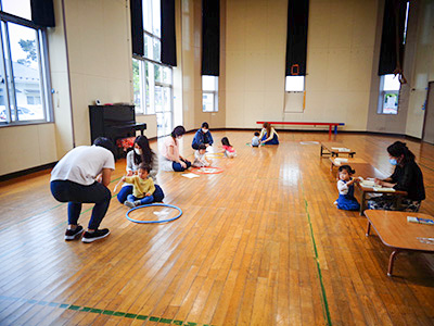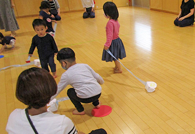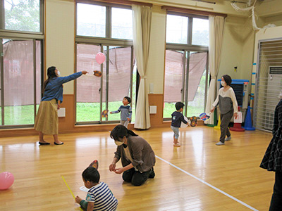 久しぶりの行事はお外に出てしゃぼん玉をとばして遊ぼう!と企画していましたが当日は雨・・・室内ではとばせないので、ボールやスカーフ、ビニール袋、風船などをしゃぼん玉に見立てた遊びを行いました。特に、風船を使ったバドミントン遊びは親子ともに笑い声が絶えず、楽しむ姿がみられました。