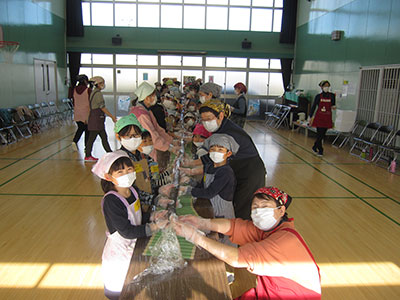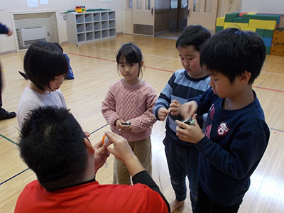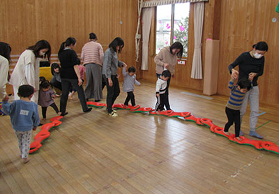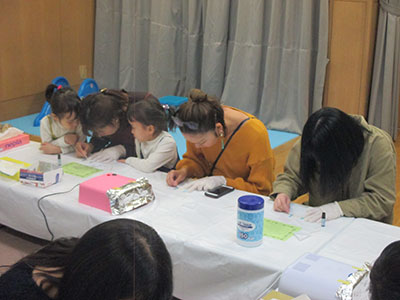 2020/01/282月3日の節分を前に、今回の幼児クラブは「豆まき」です。牛乳パックで豆箱を作り、中には新聞紙で作った豆を入れ、段ボール製のかわいらしい『赤おに』『青おに』に向かって「おにはそと~ふくはうち~」と元気に豆をまきました。お母さんたちにも、節分の由来と正しい豆まきの唱え方『天打ち、地打ち、四方打ち、おにの目ん玉ぶっ潰せ!』を伝えると「初めて知った!」と驚いていました。子どもたちは、それぞれの心の中にある「おに」をやっつけようと一生懸命で、親子で笑顔あふれる活動となりました。帰りには、節分の魔除け『ヒイラギイワシ』をお土産に配りました。一年間、災難から家や家族を守ってもらうよう玄関に飾ってもらえたら嬉しいです。