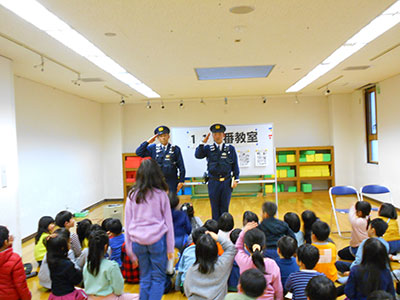 2020/01/08今年も本町交番から所長さん含めお二人のお巡りさんに来ていただき、交通事故や不審者から自分の身を守るためのお話をうかがいました。例えば、こんな時はどうする?とクイズ形式で具体的な例を出していただきました。その時自分の身を守るには?の問題に子どもたちは楽しみながら一生懸命考え答えていました。上杉児童館利用の小学生の通学路は交通量も多く、普段の道路の歩き方や一人で行動しない、人目につかない場所を通らないなどあらためて考える良い機会でした。地域や下校時の子どもたちの様子を見ていただいているお巡りさんからのお話に、子どもたちは関心を持ち集中して聞いてました。お巡りさんの存在に心強さを感じ、自分の身を守る事の大切さも再認識できた貴重な時間でした。