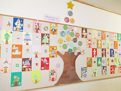小学校内児童館用掲示板に、クリスマス飾りを掲示しました。今回も、子どもたちの作品です。台紙にツリーを貼り、シールや切り抜きで飾りつけて作りました。子どもたちの発想は豊かで、木と言っても、緑だけではありません。ポップな模様の木に、たくさん飾りが貼ってあり、それでもまとまっています。クレヨンや色鉛筆で、さらに動物を描いたり、雪を降らせたりして、とても華やかなツリーです。それを60枚ほど飾ってあります。出来栄えに子どもたちも大満足で、「ぼくのこれだよ。」と、教えてくれる子続出でした。このままクリスマス頃まで飾ります。お迎えの保護者のみなさんも、ぜひご覧ください。