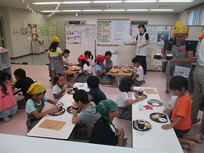 2019/08/20幸町児童館の仮館舎で開催された「キッズ・カフェ」では児童館の子ども達が素敵なウエイター、ウエイトレスになり地域のお客様をお迎えしました。ご案内状や室内の飾り・コースターなどを子どもスタッフが事前に準備し、当日は子育て支援クラブ「カラフル」さんや大学生のボランティアの協力のもと、カフェやミニ縁日も一緒に楽しむことができました。オープニングに開催した「音のレストラン・ただのなおみ氏」によるオルガニートの生演奏を聴いた後は、自分で作った作品の音を味わうワークショップにも参加しました。たくさんの笑顔が見られたこの日が、夏休みの思い出の一つになることを願っています。