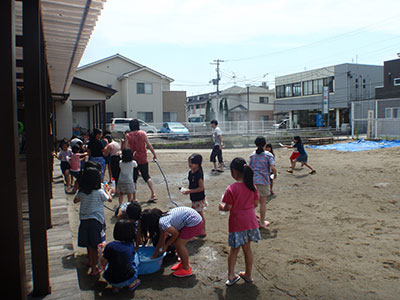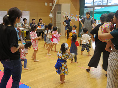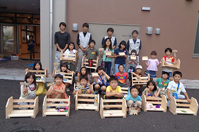 2019/07/24子育て支援クラブ「コスモス」との共催行事「木と遊ぼう」が行われました。当日は、地域の工務店に務める若い大工さんを講師としてお招きし、小学生をはじめ親子連れ20組が参加しました。のこぎりの使い方や釘の打ち方などをマンツーマンで丁寧に教えていただき、頑丈なブックスタンドや装飾に工夫を凝らした写真立てを作りました。「うまく切れないな。」「釘をまっすぐ打てないよ。」と悪戦苦闘。「手伝おうか?」という言葉も聞かれ、お互いに協力し合いながら、世界でたったひとつのステキな作品を作り上げ、皆満面の笑みを浮かべていました。また、端材を使って、畑に植えたとうもろこしや枝豆の名札も作りました。最後に、自慢の作品を持って、全員で記念撮影。木のぬくもりと人の温かさを感じた楽しいひと時でした。