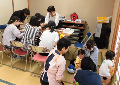 地域の方を講師に迎え、UVレジンのアクセサリー作りを行いました。これは、子育て中のママを応援しようと、子育て支援クラブ「えだまめ」の皆さんが考案してくれた企画です。ドライフラワーやビーズなど好きなパーツを選び、自由にデコレーション。ママの作業中は、子育て支援クラブと託児ボランティアの皆さんがお子さんの見守りを。キラキラと輝く、夏にぴったりの作品が完成しました!最後はお子さんも一緒にティータイム。笑顔とお喋りが弾んでいました。