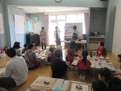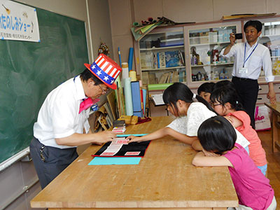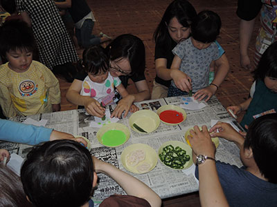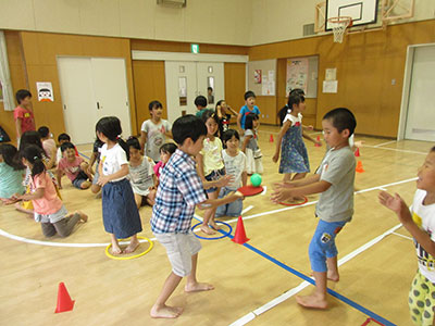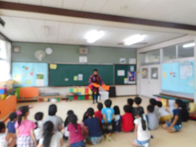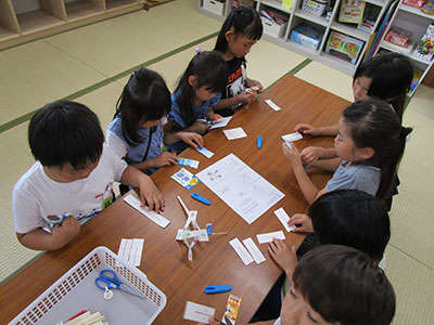 2019/06/05「こま侍がやってくるよ!」の児童館だよりを目にした子ども達は、申込開始日を待ちに待って申込み用紙を持ってきました。場所の関係で、20名しか受け入れることが出来なかったのですが、こま侍の計らいでパフォーマンスなら何人でも大丈夫とのことで、35名が参加しました。子ども達は、こま侍の1つ1つの技に目を見張り、拍手を忘れるくらい集中し見入っていました。こま指導を受ける子ども達の殆どが、こまを回せる子たちで、こま侍のパフォーマンスをイメージしながら大皿から順に超小皿までこまを入れることや、金魚すくい、線香花火と技に挑戦していました。中には、手のせから綱渡りの大技を出来る子もいました。初めての子も、紐かけをして回せるようになり大満足でした。