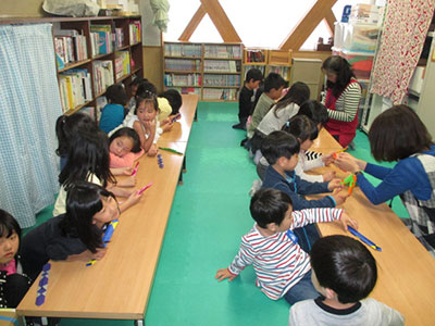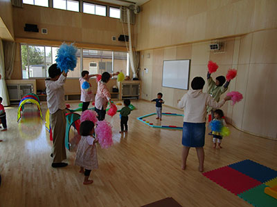 2019/05/15令和元年度第1回目のチャレンジ・ザ・かむりくん「作ってあそぼう」は紙コップロケットを作って遊びました。最初に紙筒とポリ袋で発射台作りです。空気が洩れないように2人1組で協力して作りました。次に紙コップに絵を描きます。これで完成!息を吹き込んでパンパンになったポリ袋の中の空気を一気に押し出すとロケットが勢いよく飛び出しました。打ち上げ成功です。コツをつかんだお友達は勢いよく打ち上げ天井直撃です。部屋中にポンポン打ち上げの音が響き渡り楽しく活動することができました。