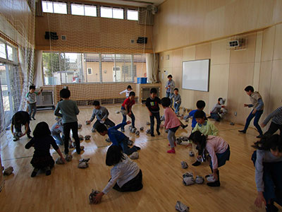 次は「ボン・バ・ボーン」のチーム対戦ゲームです。1~5年生まで混合チームに分かれ、いざスタート!制限時間内にいかに相手陣地に多くバクダンを投げ込むか、みんなで協力しながら必死に投げ返す様子が見られ多いに盛り上がりました。さすが高学年は投げ込むタイミングなど作戦を考えながら工夫していました。笑顔いっぱいのひとときでした。