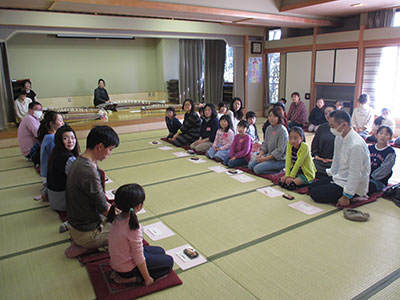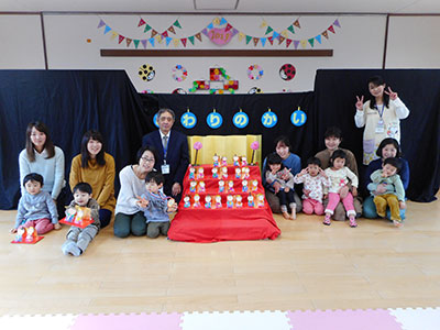 今回は『春のお茶席』 少しの間、お子さんを預け、ひな人形やつるしびなが飾られたお部屋でぴよママ♪クラブの方によるお点前を楽しみました。春らしいかわいい和菓子とおいしいお抹茶。普段忙しいママたちにとって、まったり、ホッとしたひとときになりました。