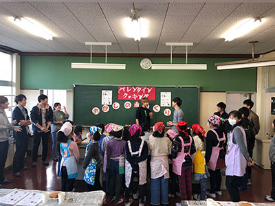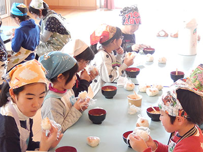 2019/02/16毎年好評の「仙台みそdeスマイル」。今日は6月に仕込んだみそを開ける日です。明成高校の月本先生が樽を開けると、みそのいい香りが部屋中に広がり、樽から上げたみそをみて「わぁー」という歓声があがりました。早速出来上がったみそで、おみそ汁とみそおにぎりを作って試食しました。おみそ汁の具は、ねぎやお豆腐やさつまいも、チーズなど色々。大豆の甘く、優しい味のみそ汁になりました。みんな「おいしい、おかわりしたい」と美味しい笑顔がいっぱいになりました。最後には味噌とはちみつとクルミで作ったソースのかかったアイスもいただき、大満足な試食タイムになりました。手前味噌になりますが、今年も、とてもおいしいみそが出来ました。