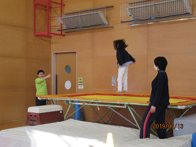 2019/02/13小学生対象の行事、チャレンジタイム‘トランポリン’を行いました。トランポリンのベテラン先生2名をゲストに招いて、トランポリンのレクチャーをしてもらいました。始めは‘チェック’の動きを覚えます。‘チェック’とは、ジャンプから‘止まる’着地動作のことをいいます。自転車のブレーキと同じですね。ふわふわとしたトランポリンの弾む感覚に戸惑いながらも、徐々に慣れていき、高く、真っすぐ、ジャンプできるようになりました。高学年のお友達は‘グー・チョキ・パー’や‘膝落ち’などの技にチャレンジしていて、とても格好よかったです。普段できない運動遊びにチャレンジできて、とっても楽しかったですね。