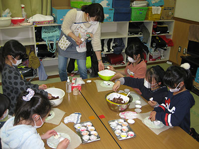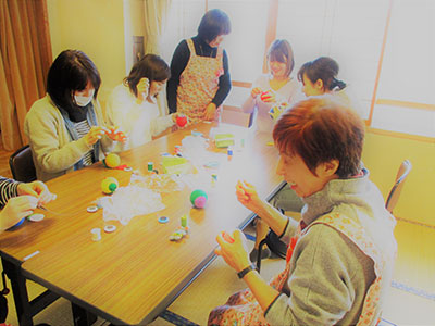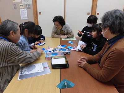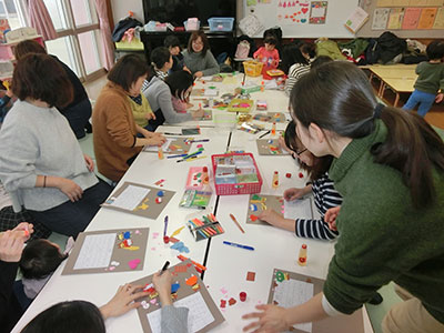 2019/01/25子育て中のママのお楽しみの時間「ママ♡Cafe」は、折り紙などで季節を感じられるカレンダー作りをし、美味しいお茶を飲みながらおしゃべりを楽しんでいただく行事です。1月は14組の親子が参加して、節分やバレンタインデーにちなんだカレンダーを作りました。ママたちはハートにもオニにもなる折り紙に挑戦し、子供たちはママが折ったカラフルなオニの顔を描くのを楽しんでいました。いろいろなオニができあがり、それぞれ違った素敵な作品が出来上がりました。0歳から2歳までの子どもたちが民生委員さんやお友達と遊んでいる間、ママたちは楽しいおしゃべりをしながらの美味しいティ―タイム。普段の倍以上に話がはずんでいました。来月もぜひ、ホッと一息できる時間を過ごしに児童館に足を運んでくださいね!