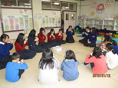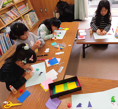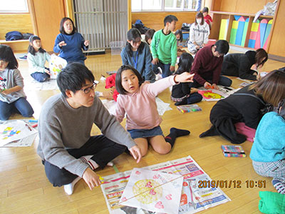 2019/01/19今年も阿部欣也さんに教えてもらい、親子で「いか凧作り」を体験しました。遊戯室には座卓の上に材料の大きな和紙や竹ひごと道具が沢山用意されてました。それを見た初めて参加する1年生は「どう作ったら凧になるのかな?」とワクワクしている様子でした。
