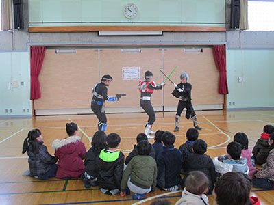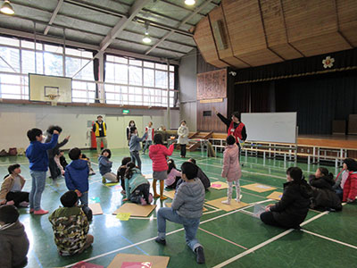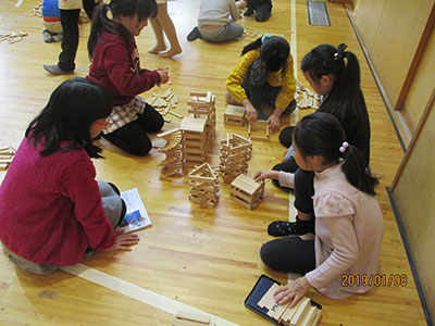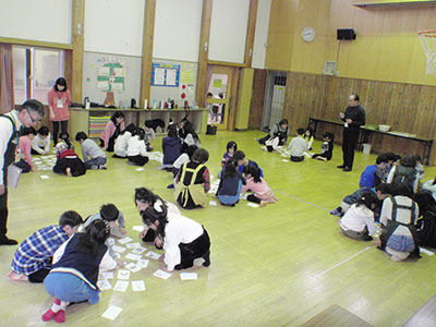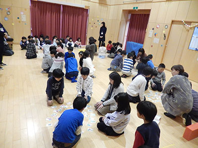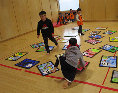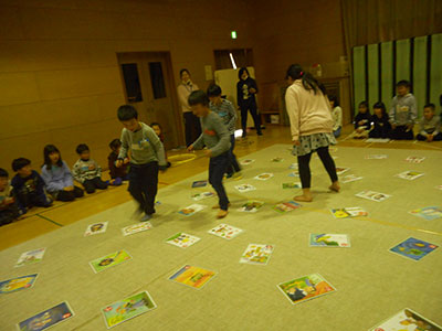 2019/01/08新春恒例の「カルタバトル」今回で5回目となりました。手作りの大型カルタを遊戯室いっぱいに広げます。前半は団体戦で、各チーム代表1名ずつスタンバイ!職員が読み札を読み上げた後、笛の合図で一斉に絵札を探します。待機しているチームメイトからは「もう少しあっち!あっ通り過ぎた!」「がんばれ!」と声援が…笑顔で絵札を探しあてチームに戻る子、絵札をとれず悔しがる子…みんな優勝目指しハッスルしました。大接戦の末10枚を獲得した黄色チームが優勝しました。後半は個人戦です。気持ちを新たに真剣な顔で絵札に向かいます。絵札をとりたい一心で笛の前にスタートしたり、お手つきする子が増え白熱したバトルとなりました。