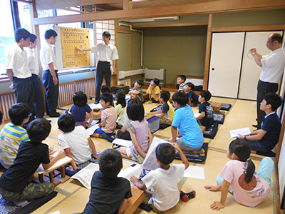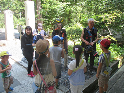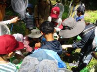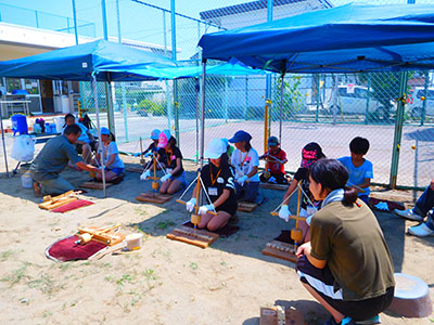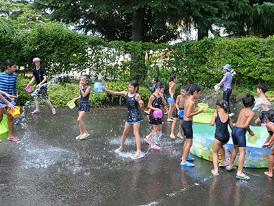 参加した子供たちは水着に着替え、家から持ってきた水鉄砲や、事前に職員と手作りしたペットボトル水鉄砲を準備して、館庭に集合しました。活動前にみんなで協力して小石拾いをした後は、スタートの合図と共に友達同士で水をかけ合ったり、勢いよく水風船をぶつけたりと大興奮!職員も参戦すると更に大盛り上がりでした。最後はホースで勢いよく放水すると「キャー!」と大きな声をあげながら、全力で走り回っていました。
