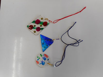 ひとり3枚のプラバンに絵を描く作業からスタートです。それぞれ好きな絵を自由に描いて、トースターで焼きます。4分の1に縮み、ここまではいつものプラバンです。次にUVレジン液を塗り、機械に入れると、ピカピカのプラバンに大変身!仕上げにビーズの金具をつけて出来上がりです。たくさん時間をかけて丁寧に作った分、参加者全員、大変すばらしい作品が出来上がり、大満足していました。