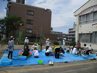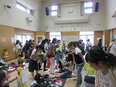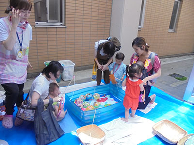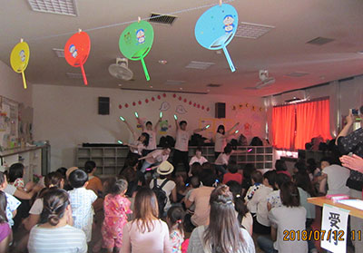 2018/07/18毎年恒例の「ムックンえんにち」。今年もかわいい甚平や浴衣姿のお友達がたくさん集まってくれました。オープニングにみんなで「ミンミン音頭」を踊り、その間おみこしも練り歩きました。縁日気分が盛り上がったところで、いよいよお店巡りスタート!ホール内はとても暑かったのですが、冷た~い「ウッディーのかき氷屋さん」「ウィージーとヨーヨーつり」「トイ☆フィッシング」など、~ふくむろTOYランド~のテーマに沿った9つのコーナーを親子で楽しみました。帰るころには、たくさんのお土産をかかえ、ニコニコ笑顔。来年も是非遊びに来てくださいね!