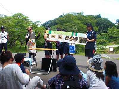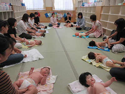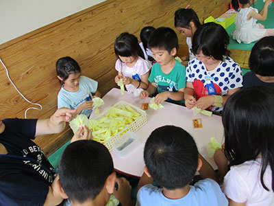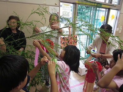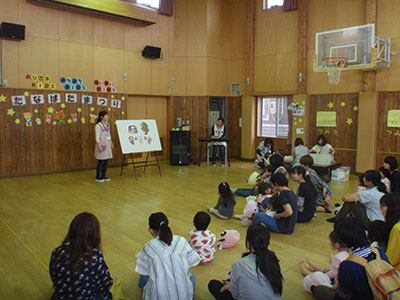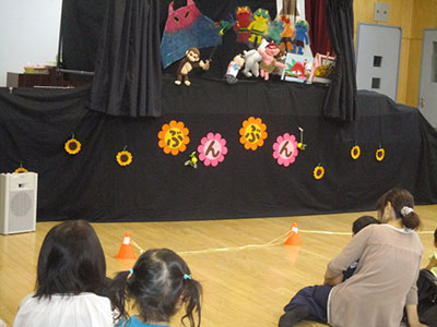 2018/07/06昨年度好評を博した、パペットシアター「ぶんぶん」さんによる人形劇鑑賞を今年も開催しました。たくさんのかわいいパペットと、生演奏のきれいな歌声に、親子で人形劇の世界へ引き込まれていきました。中盤で、「森のくまさん」の歌に合わせて、スタッフ扮するくまさんと女の子が登場し、子どもたちは大喜び。くまさんと一緒に「ひげじいさん」の手遊びを楽しみました。最後は、「桃太郎」のお話です。歌に合わせて次々に登場する人形たち。最後に鬼をやっつけた桃太郎に歓声が上がりました。終了後、テンポの良い「ぶんぶん」さんのテーマソングに合わせて、パペットが登場し、みんなとお別れ。親子で笑顔溢れる楽しいひと時となりました。