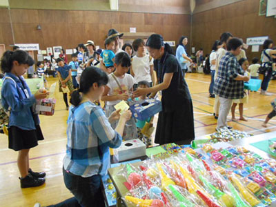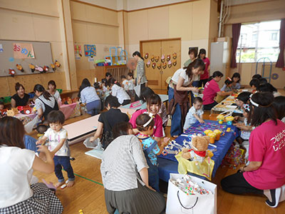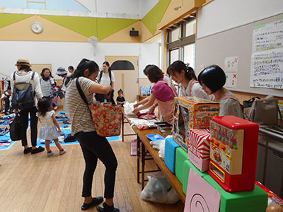 毎年大好評、子育て支援クラブ『たmaご』さんと共催の「おゆずりバザー」!お菓子の詰め放題のお店も同時開催され、大好評でした。今年は、一人1点まで使用できるお得な半額券も導入!お母さんたちは真剣な表情で品物を選んでいました。今回の目玉商品は2点、どちらも100円のお買い得商品でした。恒例の目玉商品の抽選会も行われ、購入権を獲得したお母さんたちは大満足だったようです。当日ご来場頂きました皆様、提供品のご協力を頂いた皆様、大変ありがとうございました。収益金で子どもたちのおもちゃを購入する予定です。どうぞお楽しみに!
