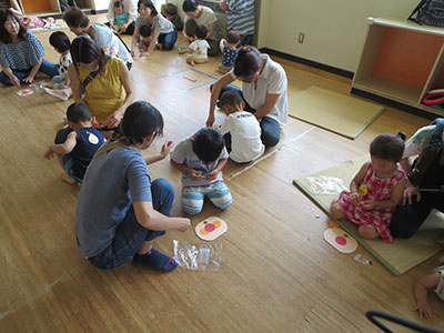 今年も大人気の行事、キラキラサンサン合同ちびっこまつりが開催されました。今年は、乳幼児親子にそれぞれお店屋さん、お客さんになっていただくお店屋さんごっこでした。それぞれの乳幼児クラブで、事前にお店屋さんで売るお面やアクセサリーなどを作っていたので、みんなお店屋さんごっこへの期待が膨らみ始まる前から待ちきれない様子でした。開店の合図と共に、遊戯室にはとても賑やかな声が響き渡りました。お店屋さんになりきり、生き生きとした表情で商品を売る子どもたちの姿が見られました。また、お母さん方も一緒にごっこ遊びを満喫されたようでした。終了後も、名残惜しい様子でお店屋さんを続けている子も見られました。