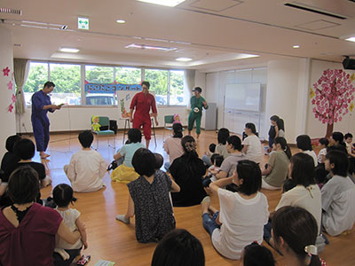 親子向けパフォーマンス集団「親子遊び専隊あいうえおもちゃばこ」による親子ふれあいあそびを中心としたコンサートを虹の丘児童センターと共催で行いました。上谷刈地区及び泉中央南地区の子育て世代を応援しようと4年前から愛泉会望岳荘交流ホールをお借りしての開催です。