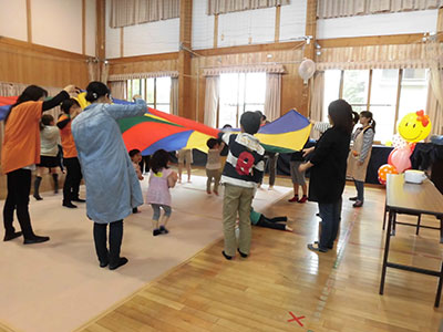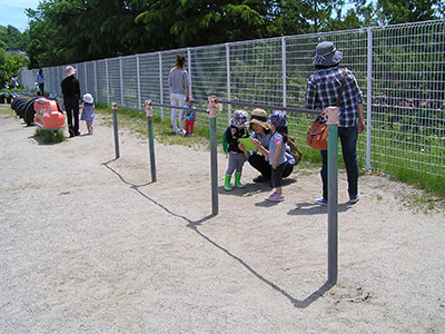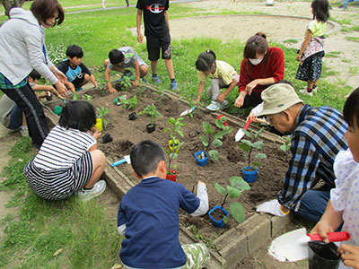 2018/05/23「花壇にお花を植えよう」という行事を行いました。子育て支援クラブさんより野菜の苗を購入してもらい、当日も2人のお手伝いを頂きながらスタート。乳幼児親子や小学生たちと一緒に野菜の苗を植えました。なす・トマト・きゅうり・パプリカなど多くの苗に子どもたちは歓声をあげ、「穴はこれぐらいで良いですか?」と、支援クラブの方に質問しながらスコップで穴を掘り一つ一つ丁寧に植えていました。最後に、参加して頂いた支援クラブの方にお礼を言い、「早く大きくなると良いなあ」と、今から収穫を楽しみにしているようでした。翌日からは、すすんで花壇に水を撒いてくれる子どもたちの姿が見られるようになりました。