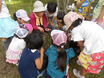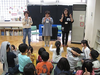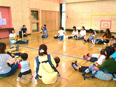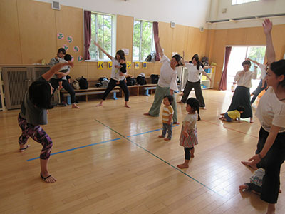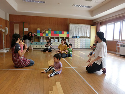 2018/05/16毎月1回の定例行事である「ちびちゃんひろば」は鶴ケ谷西児童館の中でも人気のある行事の1つです。この日の参加者は、昨年度も積極的に参加してくれた1歳や2歳の男の子たちとお母さん方でした。元気な子どもたちは広い遊戯室に入るとすぐにお友だちを追いかけるように走り回ります。でも、音楽が流れるとお母さんの膝の上に座って手遊びを一緒に楽しんだり、歌を歌ったり、元気な返事を返してくれたりしてとても賑やかでした。毎回行っている体操でお母さんの足でトンネルを作って子どもがくぐる遊びがあります。これまでなかなか通ってくれなかったトンネルでしたが、ついに他のお母さんのトンネルでもくぐれるようになりました。曲が流れている間、何度も繰り返し楽しんでる姿がとても可愛らしく見えると共に成長が感じられる行事となりました。