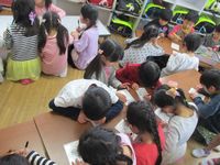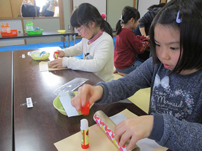 2018/04/11平成30年度始まりの行事は、新1年生歓迎の気持ちを込めてプラバン作りを行いました。幼稚園で作った事がある、と話す児童もいましたが、多くは初めての経験でした。あらかじめ用意したポケモンや妖怪ウォッチの絵を透明な板に写し書きし、裏にしてから色を塗ります。名前を書きオーブントースターで焼く係の先生に渡します。自分の描いた絵がどんどん縮んでいく様子を興奮しながら見る1年生。まだ少し熱が残るプラバンを「温かいね。」と言いながら満足気な様子。その後好きな色のひもを通し、先生に結んでもらって出来上がり。自由来館の児童も含め1年生29名で大いに盛り上がりました。