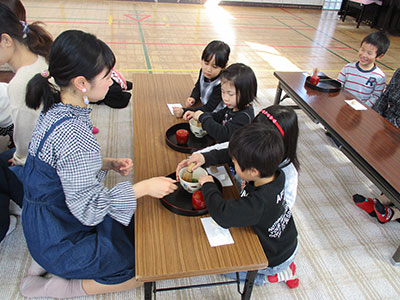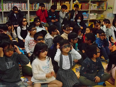 2018/03/22春休み前のお楽しみとして、県民共済の協力のもと、「3D映画上映会」を開催しました。飛び出す映画と聞いて、子ども達は次々に申し込み当日を心待ちにしていました。当日は一人一人駄菓子をもらい、いつもと違う雰囲気の遊戯室へ。県民共済の鎌田さん、小野さんから映画を見る時の諸注意を受けてから、いよいよスタート!!初めに上映する「交通安全」のアニメは、つまらないかなと思いましたが、どんどん飛び出してくるキャラクターに歓声がわきました。次の「動物園」、最後の「昆虫」の映画は立体でじっくり見られる生き物の姿に興味津々。皆ほとんどメガネを外すことなく駄菓子を食べながら、リラックスした様子で楽しんでいました。