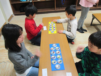 2018/03/16普段から親しんでいる「マンカラ」ですが、今年は少し勝負にこだわった「マンカラ大会」という行事を行いました。当日は1年生から4年生33名の小学生が参加しました。勝ったら押してもらうスタンプを励みにどの子も5試合しました。「次こそ勝つ!!」と頑張る子、連勝していて緊張しながら次の試合に臨む子、普段とは違う顔をしてどの子も一戦一戦、大事に取り組みました。5戦全勝の子が4人も出ました。王者の冠をかぶり、参加者から拍手を受けると、試合では真剣だった顔がほころんで本当にうれしそうでした。負けて悔しがっていた子もしっかりと拍手をしていました。どの子の表情もすがすがしく感じられました。