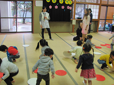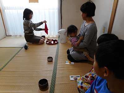 2018/03/10お茶の先生のお話から始まった春のお茶会。「茶筅(ちゃせん)は竹でできています」「和菓子をのせるのは懐紙(かいし)と言います」等々。分かりやすく紙に文字を書いて説明してくれました。その後、4~5人ずつ和室に入り、お茶席での作法等も一つ一つ丁寧に教わりながら、美味しい和菓子とお抹茶を頂きました。2歳児から大人まで幅広い年代の参加があり、飲めるか心配していた子どもたちも、しっかりお抹茶を堪能していました。幼児には少し長い時間ではありましたが、先生の美しい所作を見ながら、話に耳を傾けながらの静かなひと時は、とても有意義な時間に思えました。