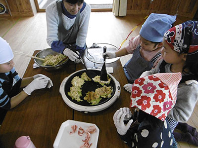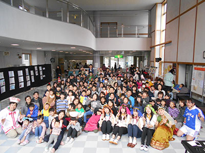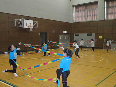 2018/02/24高砂中学校新体操部との共催で、小学生向けに新体操の体験活動をしました。中学生が日頃の練習の成果を発揮し、リボンとこん棒の模範演技を披露。そのしなやかな動きと体の柔らかさに、小学生はみな驚いていました。中学生と一緒に体の柔軟性を高めるストレッチを行った後、実際に小学生も道具をもってリボンとこん棒の演技に挑戦しました。参加者は1年生から6年生までいろいろでしたが、見よう見まねで2人でポーズをきめた時は皆嬉しそうでした。新体操を知っている高学年も、全く経験のない1年生も、今回の体験がとても楽しかったようで、中学校の新体操部に入りたいという感想がたくさん聞かれました。