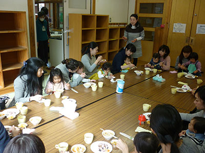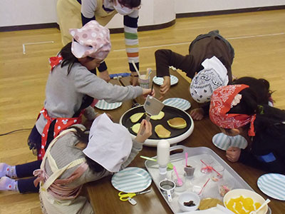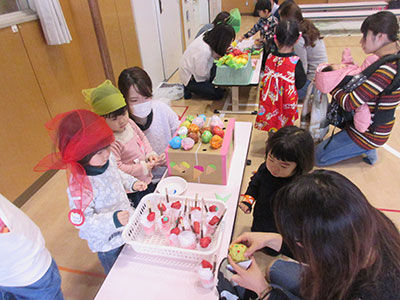 2018/02/15「バナナどうぞ」「ありがとう」ちいさな店員さんとお客さんのかわいらしい声で遊戯室が賑わっています。今日は幼児クラブ・ポッキークラブ合同のお店屋さんごっこの日。子どもたちはママと一緒に、くだものやさんにパフェやさん、やきそばやさん、ブレスレットやさんの4つのお店に分かれて、店員さんとお客さんの両方を楽しみました。お店の商品はなんと手作り。お花紙やシールを使い、アイスやくだものなどを作り、準備もがんばりました。子どもたちの気持ちのこもった商品はママもお友だちも大喜び!フードコートのスペースで、お買い物したやきそばやパフェを楽しそうに食べて遊ぶ姿も。子どもの笑顔と成長がたくさん見られた一日でした。