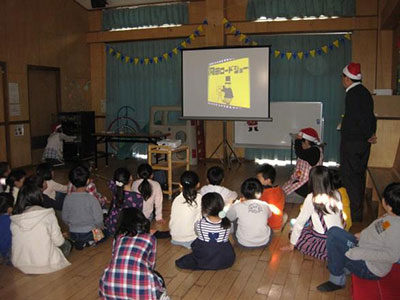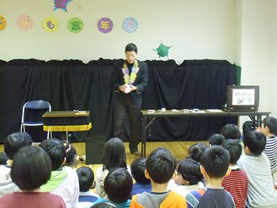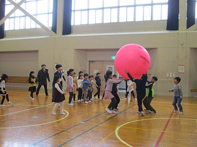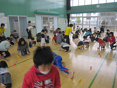 お手玉、的当て、ゴムとび、紙風船、紙コプター、紙飛行機、こま、羽根つきの8コーナーを用意。その様子の一端を紹介します。こまコーナーでは、普段使うこまより大型で重い木ごまに挑戦。始めは手こずっていた子もあっという間にマスター。羽根つきコーナーでは、初めて羽子板を持つ子も、バドミントンで鍛えた腕前でめきめき上達する姿が見られました。共催した老人福祉センターの利用者さんや児童館職員も一緒に遊びに参加し、あちらこちらに歓声や笑い声が飛び交いました。参加者は、ゆったりとした時間の中でほのぼのとした正月気分を満喫できました。