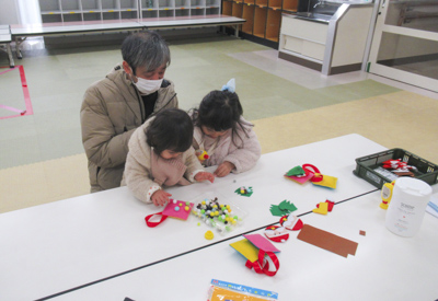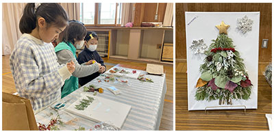 制作では、赤と緑色の三角形の画用紙を装飾し、みんなで貼り合わせて、大きなツリーにしました。