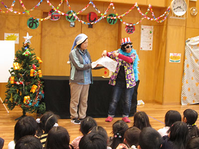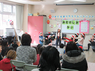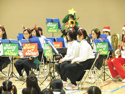 中学生の司会による進行で、楽器紹介コーナーからクリスマスソングメロディーまで、あっという間に時間が過ぎました。ドラムやトランペットのソロに、小学生の子ども達も釘付けです。広いホールをハイハイする赤ちゃんも、時折ハイハイの手を休め温かなメロディーに聞き入っていました。