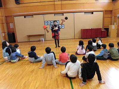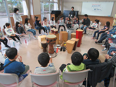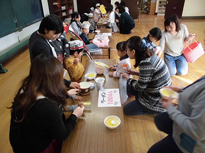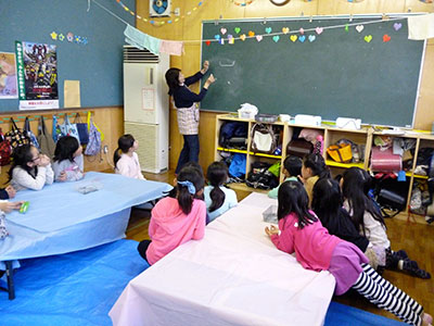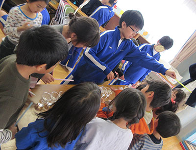まずは、実験クイズから。燃える紙が入っているビンの上に、水の入った風船を乗せたらさてどうなるかな?「割れる!」「飛ぶ!」など、いろいろな答えが小学生から出たところで実験です。その意外な結果に小学生からは「おおっっ!」と感動の声。他にもホバークラフトやCDこまなどの工作、水中シャボン玉の実験なども体験させてもらい、あっという間の一時間半でした。終わる頃にはすっかり仲良しになった小中学生。時間がなくて準備してくれた実験全部はできなかったので、次の機会を楽しみに小学生は待っています。
