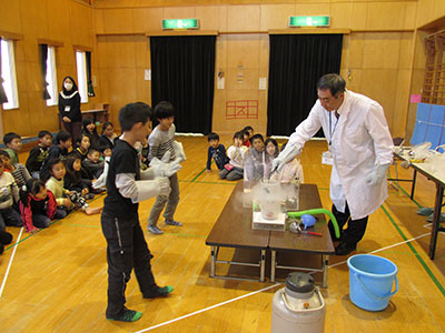 最後は全員がバルーン風船を手に持って、液体窒素の中に入れてみました。さあどうなったかというと…子どもたちは結果にビックリです!!初めての体験にみんな目をキラキラと輝かせ、橘川博士の説明をしっかりと聞き、最後には疑問に思った点を何人かが質問をして博士に答えてもらい、終了となりました。