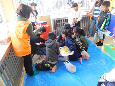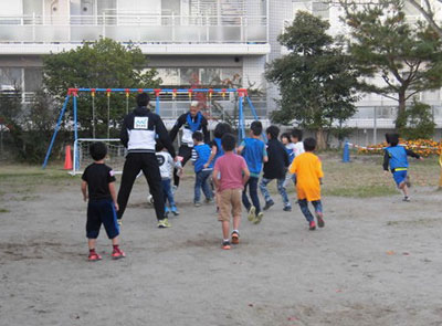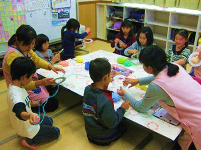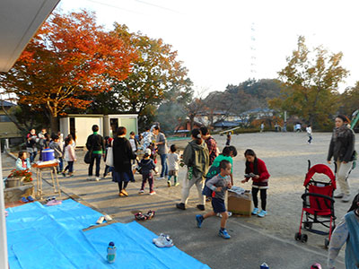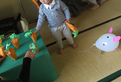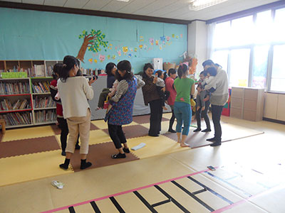 2017/11/09子育て支援クラブ「ポピー」との共催で、なおちゃん先生こと上野直美氏を講師に迎え、「レッツ!親子ビクス」を行いました。前半は首が座った赤ちゃんから2歳になったばかりの親子、後半は2歳から4歳の親子に分かれて楽しみました。前半は、お母さんがお子さんを抱っこしながら音楽に合わせて、腹筋や体幹を鍛えることがメインだったので、お母さん達は良い汗をかき気持ちの良いリフレッシュができました。後半は、「犬のおまわりさん」に合わせて体をほぐした後、遊戯室全体にマット・はしご・トンネルを広げ、仮面ライダービルドの曲がかかると、子ども達はでんぐり返しや逆上がりの練習に挑んでいました。いい汗をかき、楽しい時間を過ごすことができました。