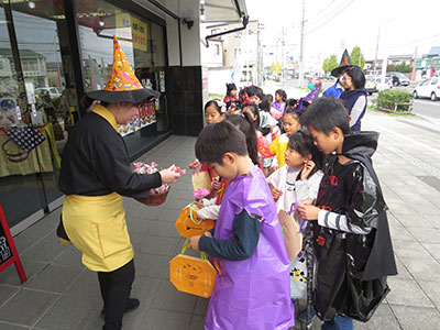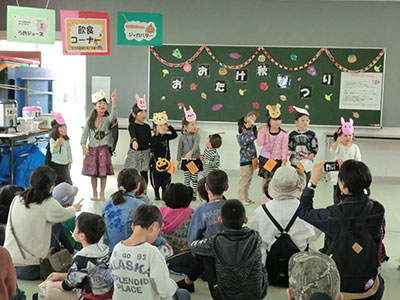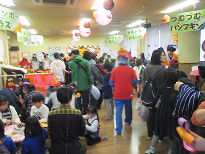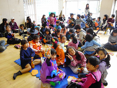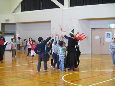 2017/10/30 今回の「あそんじゃおー」は、普段行っている「タオル鬼」の「タオルでタッチ」を、デビルのスティック(空気を入れて膨らませるビニール製)でタッチし、さらに鬼は、黒い画用紙で作った手作りの魔女の帽子、お化けかぼちゃのお面、デビル角のカチューシャをつけて追いかける鬼ごっこを行いました。