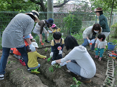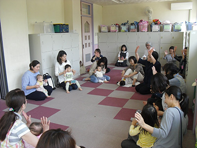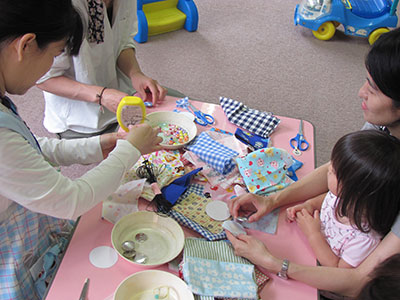 2017/05/25今月の「ママとつくろう」は、育児とは違う時間を過ごし、ものを作る喜びを味わってもらうことを目的に、くるみボタンでヘアアクセサリーをつくりました。難しそうンくるみボタンですが、キットを使うと簡単に作ることができます。たくさんの生地の中から気に入ったものを選び、丸くカットして土台にかぶせ、脚の部分をはめ込み、ゴムを通して完成です。ママ達は、できあがりを想像して、生地を選ぶことから楽しんでいました。お子さんの小さくなった服の生地を使うこともできるとお話しすると、「早速やってみます」との声が聞こえてきました。できあがったゴムで髪の毛を結んでもらったこども達はニコニコでした。みんなで楽しい時間を過ごすことができました。