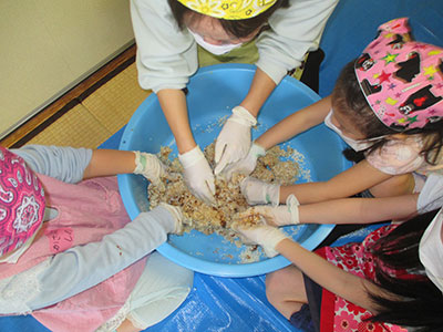 昨年に引き続きアウトドアクッキングは、好評の「スネークパンを焼こう」です。天候にも恵まれ、ぽかぽか陽気の中、小麦粉を練ったり丸めたり、またバター作りのための生クリーム振りに、興味津々、目をキラキラさせて取り組んでいました。職員の手を借りながらのマッチ擦り体験も、マッチの細い軸を持ち、恐るおそる箱に擦りつけ、見事火がついた時の、怖さと嬉しさの入り混じった複雑な表情が印象的でした。その後、膨らんだ生地を炭火で焼き、バターをつけたりシチューに浸したりして食べ、「おいしい!」と満面の笑顔に。子どもたちにとって、一つ一つの作業が真新しく新鮮な経験で、お腹も心も大満足の一日になったようでした。