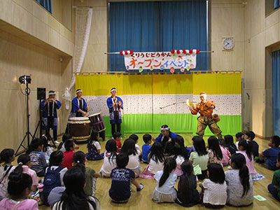 栗生児童館が開館して早2ヵ月、晴天に恵まれたこの日「オープンイベント」が行われました。オープニングを華やかに盛り上げてくださったのは民族歌舞団ほうねん座の皆さん。太鼓や笛の迫力ある音、見事な体の動きにすっかり引き込まれてしまいました。お獅子に頭をガブッとしてもらい大興奮。みんなの幸せと栗生児童館のオープンを盛大にお祝いしてもらいました。その後は「めざせ!チャンピオン」と題して4つのゲームに挑戦!最後にチャンピオン紹介をして楽しかったオープンイベントも終了です。会場の装飾や当日の手伝いをしてくれた小学生のみなさん、ありがとうございました。そしてこれからも栗生児童館を末永くよろしくお願いいたします。