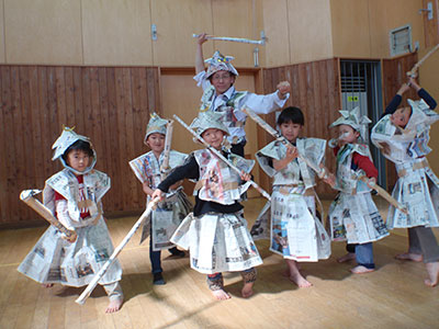 5月20日に児福協の皆さんに兜つくりを教えていただき、かみしもやはかまも新聞紙でつくりました。皆で身につけそれぞれに工夫してつくった剣をにぎり、児福協の剣道経験のある先生方を相手に、真剣に勝負を挑みました。「えーい!!」「やー!!」「めーん!!」と声が飛び交い、周りで見ている皆も応援に熱がはいりました。館長先生も新聞紙のかみしも・はかまを身にまとい子ども達を相手に真剣勝負となりました。子ども達の勢いに手加減せず、「館長先生1本!!」の判定に子ども達も挑戦がとまらず大いに盛り上がりました。大和児童館では児福協の皆さんに協力いただいてこれからも、楽しい行事を行っていく予定です。