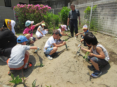 今年もおいも植えの季節がやってきました。当初予定していた13日は大雨になり…、一週間延期になった20日は、お天気もリベンジしたかのような晴天!青空の下、40名の幼児親子~小学生が集まってくれました。3月まで児童館にいらっしゃった渡邉前館長先生に植え方のコツを教えていただき、いざ畑へ!土を掘って、寝せるように苗を置いて、優しく土をかけて。最後にたっぷりのお水をあげました。これからぐんぐん大きくなって、秋にはおいしいおいもがたくさん採れますように。そして、おいしい焼きいもにしてお腹いっぱいいただける日を楽しみに、大切に育てていきましょうね♪