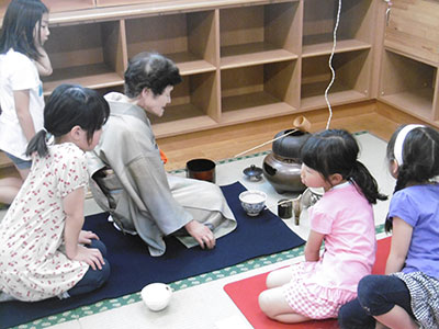 サタデーどんどん「お茶を楽しみましょう♪」は、表千家の若竹伶子先生に茶道の作法と所作を教えていただきました。児童クラブ室に毛氈を敷き、花と短冊を飾って茶釜を置くと、即席の茶席ができあがります。子どもたちは神妙な面持ちで正座して先生のお話を聞き、教えられたとおりにお茶をいただきました。お抹茶の前には若竹先生手作りの干菓子をいただき、「おいしい!」との声。子どもたちからは、干菓子の材料は何かやお茶碗の絵柄には意味があるかなどの質問も出ました。いつも賑やかな児童館がこの時ばかりは静かな別世界となり、一緒に参加したお母さんからは、穏やかな良い時間を過ごすことができましたという感想もいただきました。