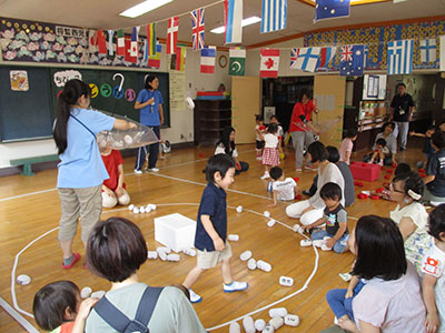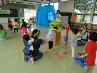 まずはラーメン体操をおどって腹ごしらえ。かけっこで海賊になるための勇気が試されました。いよいよ海賊船に乗って大海原へ出発!海の魔物を玉入れでやっつけたり、親子でキャタピラーに入って突き進みました。保護者対抗綱引きは、パパの活躍もあり大盛り上がりでしたね。最後に、バラバラになっていた宝の地図をみんなで完成させると、岩の陰から宝箱発見!立派な海賊になり、キャプテン館長からメダルをかけてもらったみんなの顔はとても誇らしげでした。参加してくれた皆さん、お手伝いをしてくださった支援クラブの皆さん、ありがとうございました!