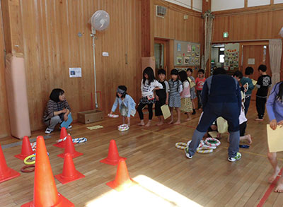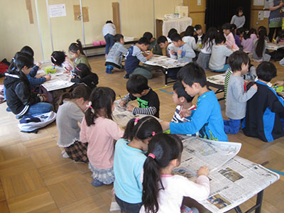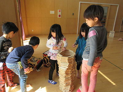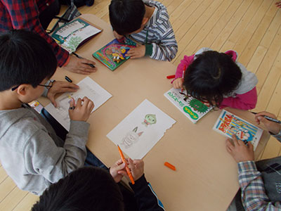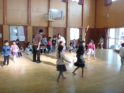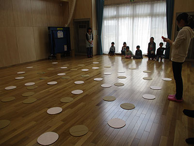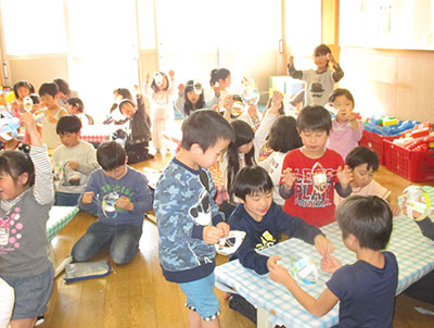 2017/04/24今年の「みんなあつまれ!」は、キラキラひかる3Dぶんぶんゴマ作りでした。キラキラって?3Dって?と、どんなものを作るのか、みんな興味津々です。まずは、普通のぶんぶんゴマとは違う十字の形の台紙にお好みで模様をつけます。水玉にしましま、それぞれ工夫して描いていました。模様が描けたら、次は台紙をくるりとまるめてのりでペタリ。これで立体的な形になります。糸を通してキラキラシートを貼れば、、、まわすとしゃぼん玉のようにキラキラひかる3Dぶんぶんゴマの完成です。最初はうまくまわせなかった子も、練習して上手にまわせるようになりました。最後は全員でコマをまわしながら写真撮影。みんなの笑顔もキラキラ輝いていました。